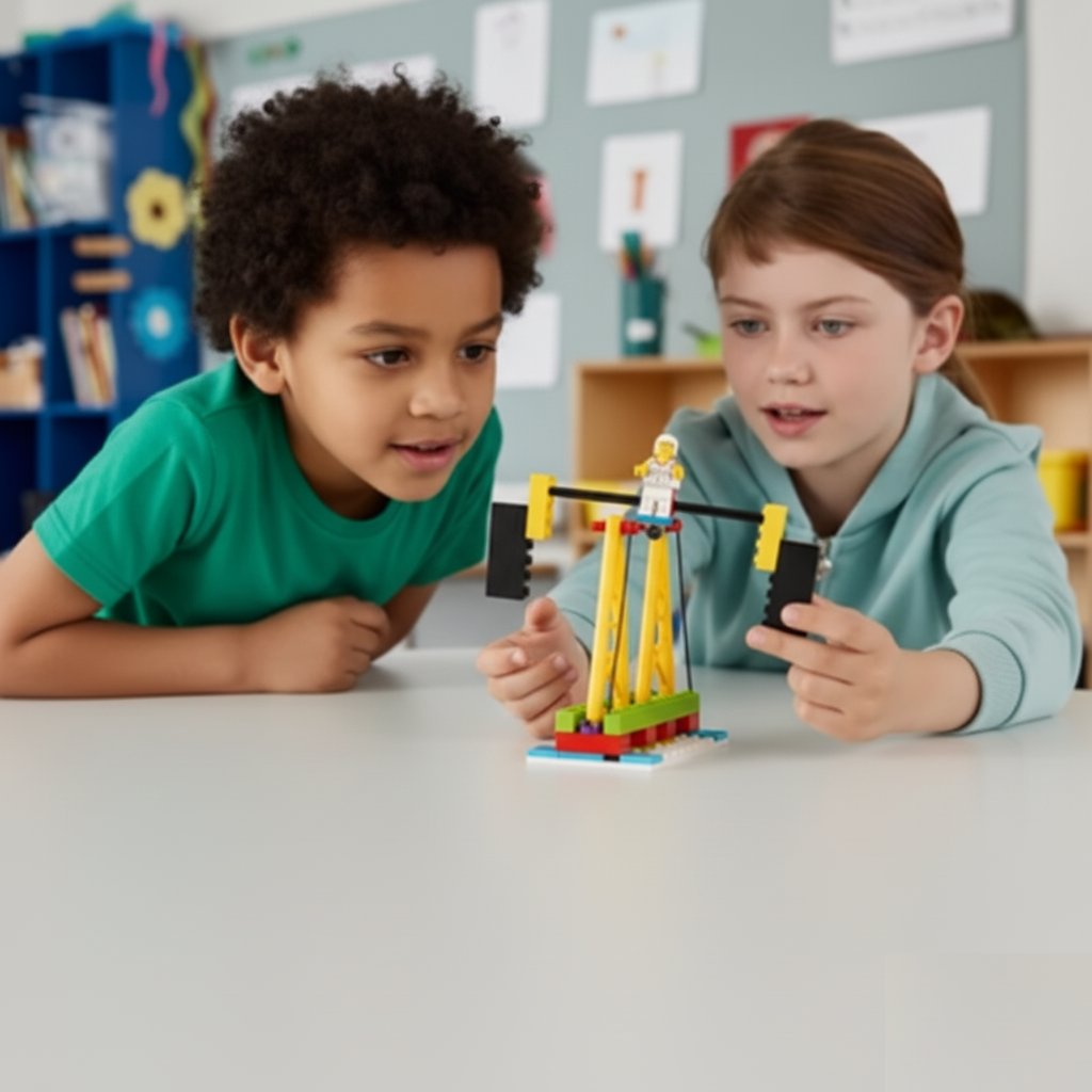 Solução esperada: Montar uma ponte com motor e sistema de roldanas e programar movimentos em intervalos regulares. As crianças exploram na prática os conceitos de alavancagem, sistemas de roldanas e transmissão de força através das engrenagens. Eles entendem como um motor pequeno pode levantar uma estrutura pesada usando a vantagem mecânica.